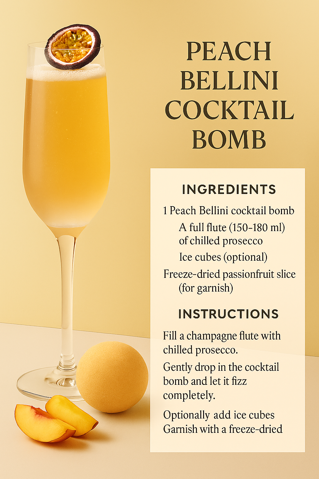 Sparkle meets sophistication. The Peach Bellini Cocktail Bomb brings the charm of an Italian brunch straight to your glass. Subtly sweet and perfectly bubbly, it’s the golden-hour drink you’ll want on repeat.